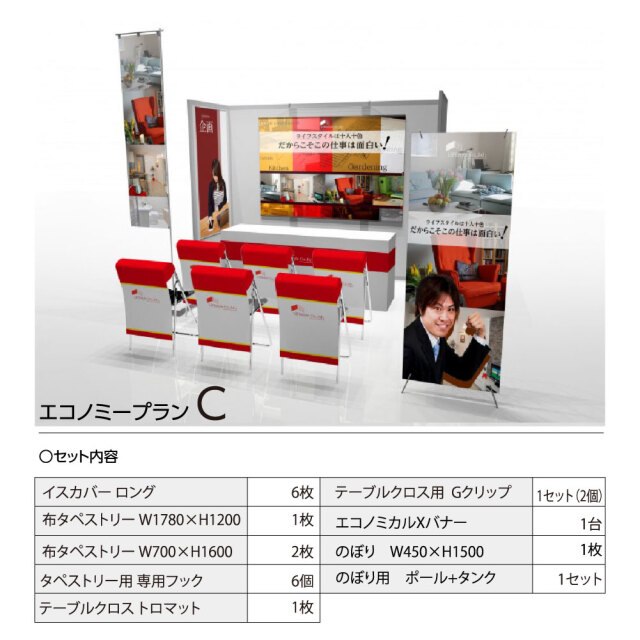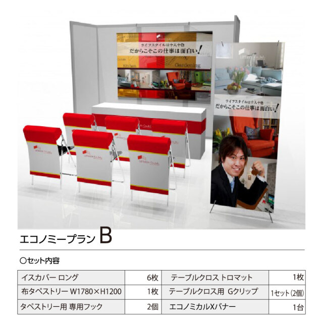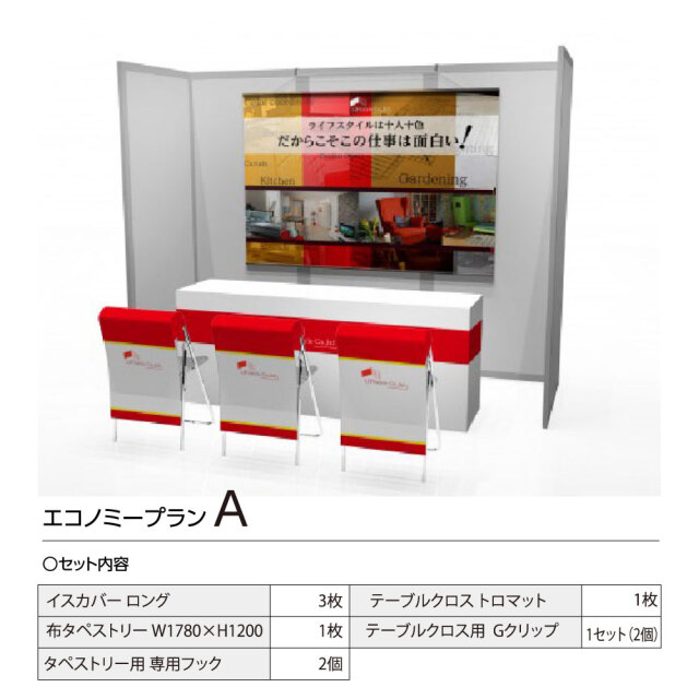 エコノミープランA ・イスカバー ロング 3枚 ・布タペストリー W1780×H1200 1枚 ・タペストリー用 専用フック 2個 ・テーブルクロス トロマット 1枚 ・テーブルクロス用 Gクリップ 1セット(2個) エコノミープランB ・イスカバー ロング 6枚 ・布タペストリー W1780×H1200 1枚 ・タペストリー用 専用フック 2個 ・テーブルクロス トロマット 1枚 ・テーブルクロス用 Gクリップ 1セット(2個) ・エコノミカルXバナー 1台 エコノミープランC ・イスカバー ロング 6枚 ・布タペストリー W1780×H1200 1枚 ・布タペストリー W700×H1600 2枚 ・タペストリー用 専用フック 6個 ・テーブルクロス トロマット 1枚 ・テーブルクロス用 Gクリップ 1セット(2個) ・エコノミカルXバナー 1台 ・のぼり W450×H1500 1枚 ・のぼり用 ポール+タンク 1セット |